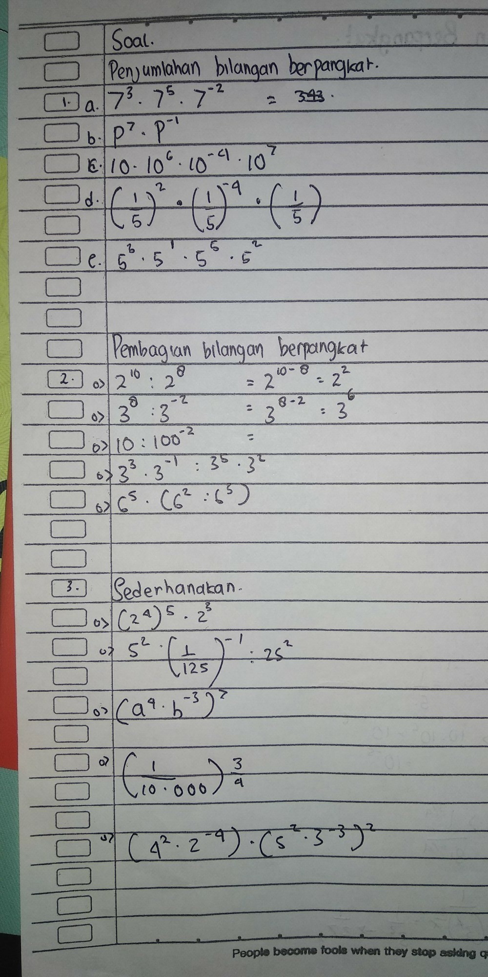 Dengan kedua contoh diatas, sudah bisa menjelaskan tentang sifat penjumlahan dari bilangan berpangkat menggunakan bilangan pokok sama, . Jadi semoga bacaan ini bermanfaat bagi kita semua. Pengurangan dan penjumlahan bilangan berpangkat. Artinya jika pangkat dua bilangan berbeda, maka tidak bisa dijumlahkan atau dikurangkan. Bilangan negatif merupakan invers dari bilangan positif terhadap operasi penjumlahan. Arich susyanti 1 year ago. Belajar bilangan bulat berpangkat positif · cara cepat dalam . Rumus operasi penjumlahan bentuk akar:. Caranya dicari dulu 2 pangkat lima dan 2 pangkat tiga lalu dijumlahkan kecuali kalau perkalian bilangan pokok sma pangkat dijumlah. 3^3 + 3^5 = 3' x. Selain itu bilangan berpangkat juga memiliki operasi hitung penjumlahan maupun pengurangan. Bilangan berpangkat adalah cara penyebutan sederhana dari sebuah bilangan yang memiliki angka. Bagaimana dengan rumus pembagian dua bilangan berpangkat?